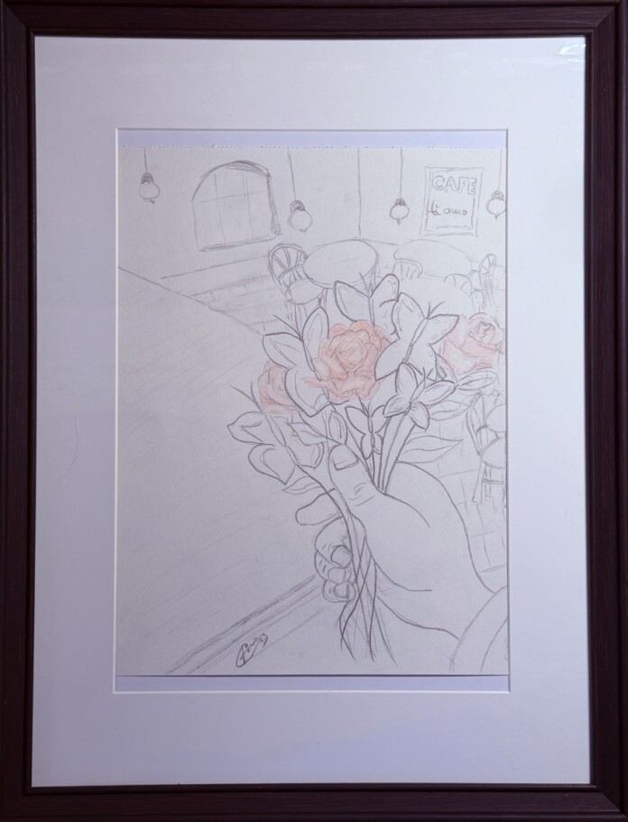 Dieses Bild ist eine Darstellung der Verliebtheit, jedoch statt der Schmetterlinge im Bauch sind diese mit den Rosen an einem Straus. Der Treffpunkt ist in einem Café.